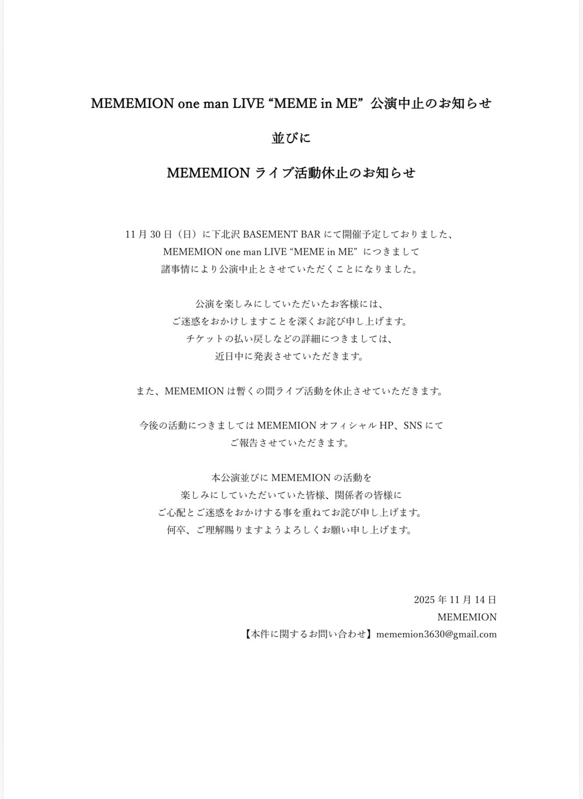MEMEMION one man LIVE “MEME in ME” 公演中止のお知らせ 並びに MEMEMIONライブ活動休止のお知らせ