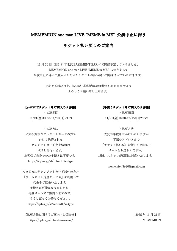 MEMEMION one man LIVE “MEME in ME” 公演中止に伴うチケット払い戻しのご案内